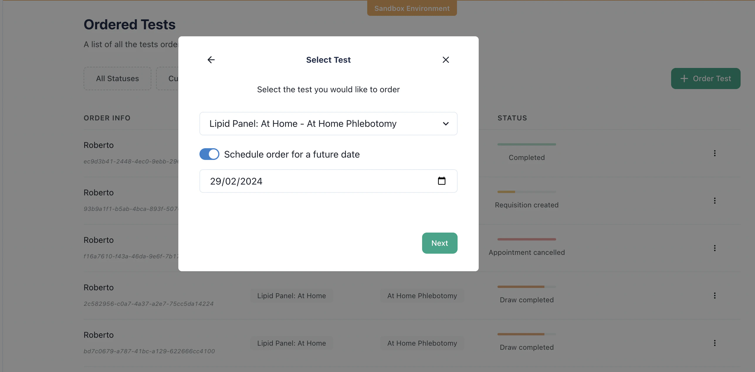 Junction provides a way to schedule your orders for a future date, both via the API and via the Junction Dashboard. A Scheduled order is one that will only be fulfilled in the future, so it won’t be created in the Partner Laboratories until the defined date. This is useful for defining follow-up orders after placing an initial Lab Order for a patient.