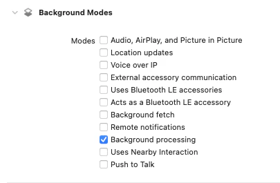 | Permitted background task scheduler identifiers ( BGTaskSchedulerPermittedIdentifiers) | Include io.tryvital.VitalHealthKit.ProcessingTask in the array, alongside any other BGTask identifiers of yours. |