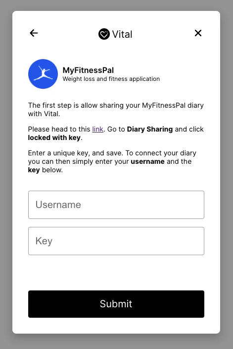 You can now use the key and your MyFitnessPal username when linking with Junction via the widget or programmatically.